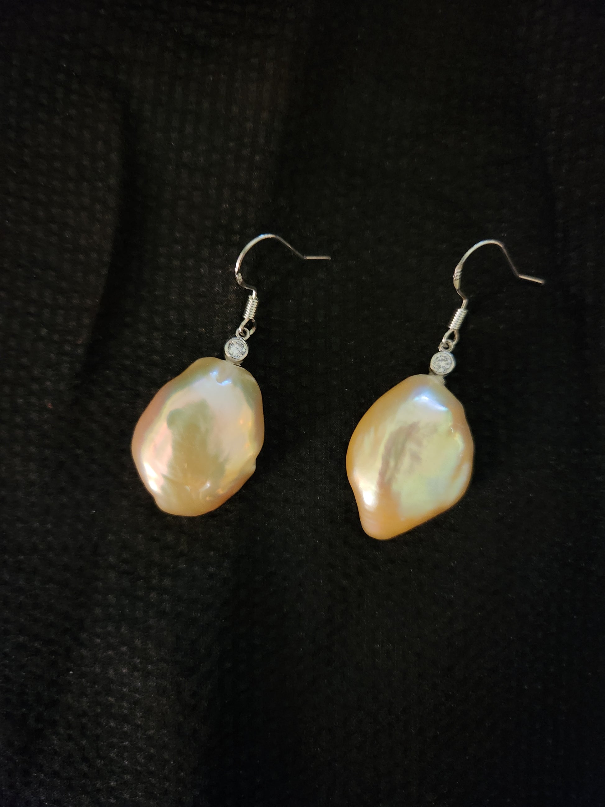 A uniquely shaped pair of baroque pearl earrings with orange metallic luster.